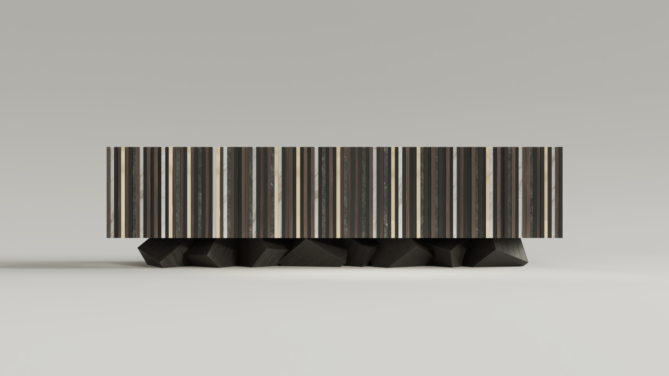 Labradorite, walnut, moabi, marble, polished brass.